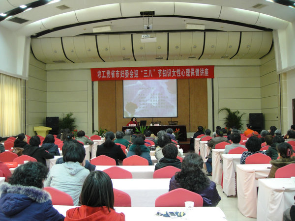 3月7日下午,江苏饭店的园中厅礼堂气氛热烈,来自农工党江苏省直和南京市近200位农工女党员们聚集一堂,参加农工党江苏省市妇委会举办的迎“三八”节知识女性心理健康保健讲座活动。这也是江苏省市妇委会2009-2012年度“关爱女性、共建和谐”系列活动的第三个项目。省市妇委会主委、南京市副主委、南京市规划设计院副院长、副总规划师程大林同志主持讲座,并代表省市妇委会向姐妹们致以节日祝贺,对大家给予妇委会工作的关心和支持表示感谢。
