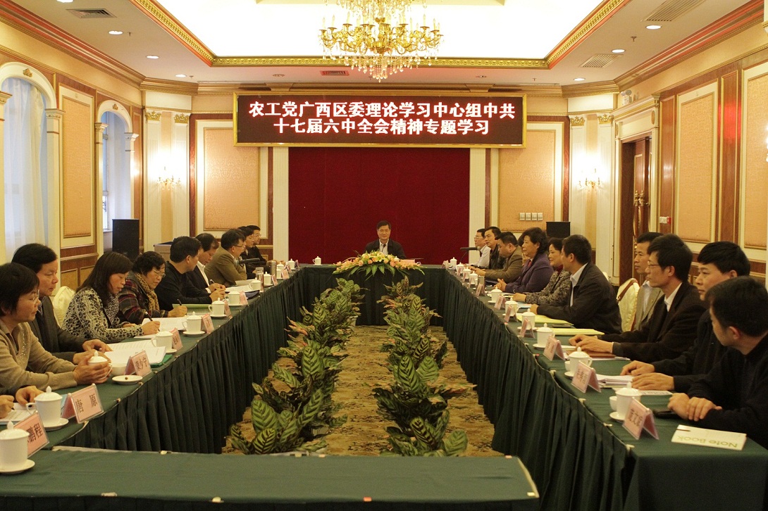 2011年12月28日下午,农工党广西区委会理论学习中心组进行了第三专题的学习,内容是学习贯彻中共十七届六中全会精神。自治区政协副主席、农工党广西区委主委彭钊主持学习,江红兵、李力、何玉庭、覃建平、邹志刚等六位同志进行了专题发言。(蒋冰)