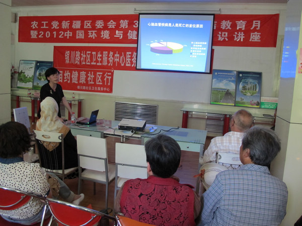 2012年5月30日,农工党新疆区委会与新疆医科大学中医学院直属医院联合举办了第三十个“民族团结教育月”暨2012(第五届)“中国环境与健康宣传周”活动。今年“民族团结教育月”和“中国环境与健康宣传周”活动的主题分别是:“热爱伟大祖国 建设美好家园”和“绿色经济与健康”。自治区中医医院心内一科主任、主任医师、教授王晓峰在此次活动上为各位社区居民讲授了“高血压、高血脂、高血糖”的防治保健知识。农工党新疆区委会副主委、自治区政协委员、乌鲁木齐市政协常委、乌鲁木齐市儿童医院首席儿科专家王平道参加活动并讲话。农工党新疆区委会副主委、自治区政协常委、自治区人民医院血液科主任、主任医师王晓敏主持了讲座。