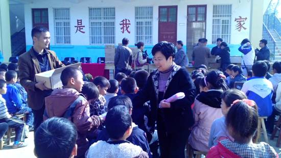 照片说明:原连庄(中)在为原阳县陈杏兰村小学的学生们赠送文体用品