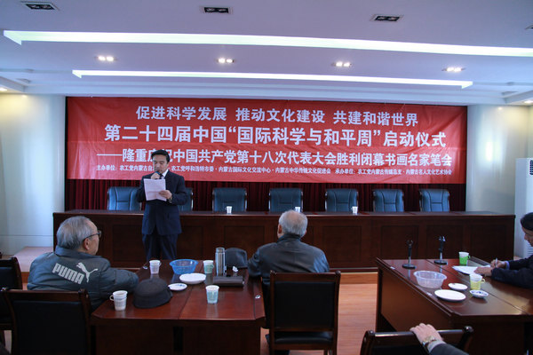 2012年11月15日,农工党内蒙古自治区委、农工党呼和浩特市委、内蒙古国际文化交流中心、内蒙古中华传统文化促进会联合举办第二十四届中国“国际科学与和平周”启动仪式——隆重庆祝中国共产党第十八次代表大会胜利闭幕书画名家笔会,来自我区书画界的30多位名家汇聚一堂,切磋技艺、交流心得,现场创作了多件书画作品。自治区政协副主席、农工党内蒙古自治区委主委牛广明出席活动。