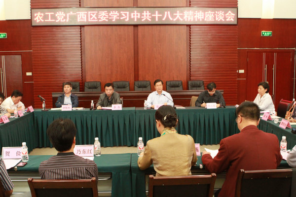 11月15日下午,农工党广西区委在机关一楼会议室召开学习中共十八大精神座谈会。自治区政协副主席、农工党广西区委主委彭钊参加座谈会并作学习辅导。区委副主委李力、唐振柱,副巡视员孟刚参加会议。区委专职副主委何玉庭主持会议。