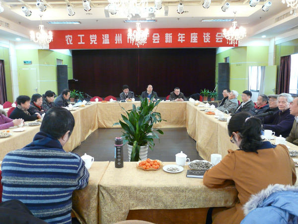 1月6日上午,农工党温州市委会新年座谈会在龟湖饭店举行。离任的市委会委员、退休支部主委等20余人参加了会议。市委会主委连庆泉主持会议,副主委郑志强、王谦出席会议。