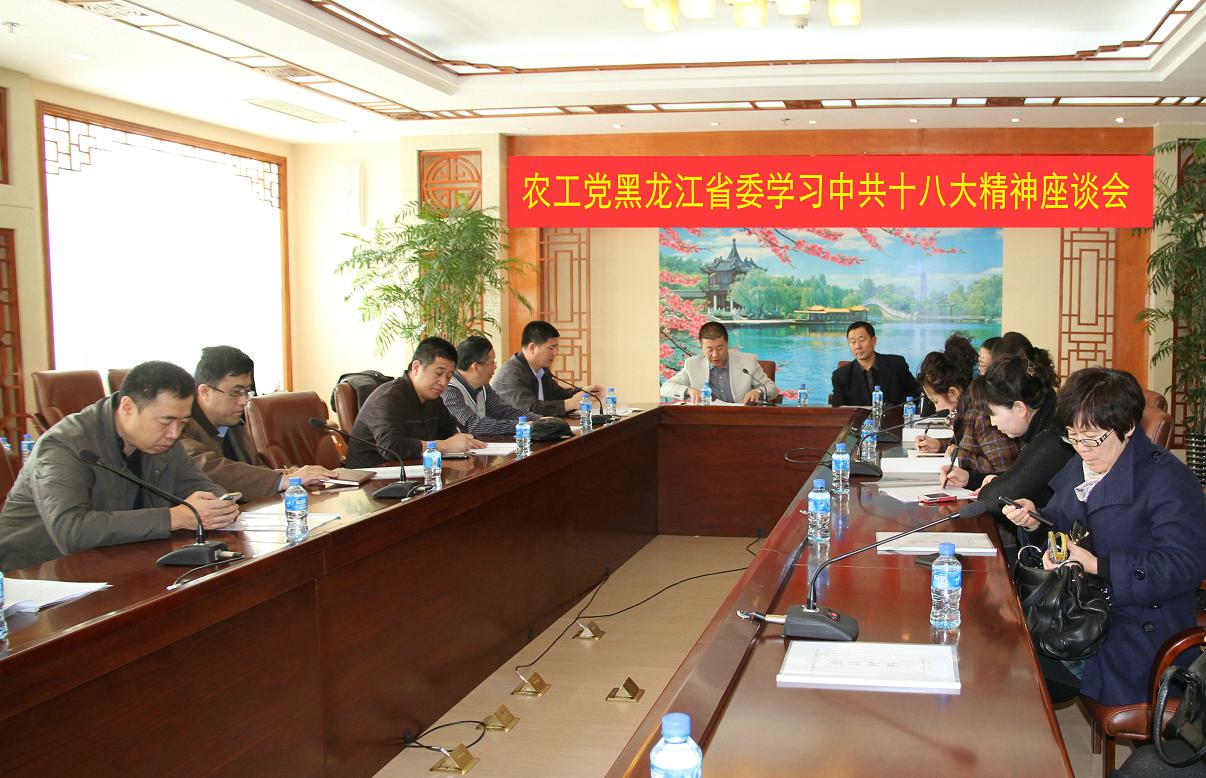 4月9日,农工党黑龙江省委在哈尔滨召开学习贯彻中共十八大精神座谈会,对中共十八大精神精研、细读、再学习。省委会驻会副主委刘长青主持会议并讲话,来自省直组织的主任委员和省委会机关干部参加座谈。