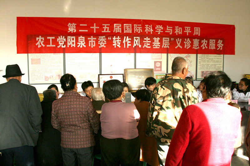 为喜迎十八届三中全会胜利召开,进一步推进“转变作风、加强自身建设年”活动深入开展,11月10日,在第二十五届国际科学与和平周来临之际,农工党阳泉市委组织党员到平定县冠山镇后沟村开展“转作风走基层”义诊惠农服务活动。 活动现场,来自市一院、二院、三院、中医院、阳煤集团总医院各科室的十余名党员专家组成的医疗队热情的为村民们进行了现场义诊和健康咨询,共服务群众300余人次。 后沟村是个纯农业村,素有“龙筋”之称的黄瓜干就盛产于该村,蔬菜种植是后沟村百姓发家致富的支柱产业,全村蔬菜种植面积达200余亩。义诊结束后,农工党成员一行还参观了后沟村蔬菜大棚基地,农工党员、阳泉市蔬菜中心副主任、高级农艺师李红为村民进行了专业技术指导。农工党成员利用周日休息时间深入农村为百姓义务上门服务的行动,赢得了村民们的高度赞扬。 “国际科学与和平周”是联合国发起的一项社会活动,在我国已经成为一项公众积极参与的“品牌”活动,具有广泛的社会影响力。农工党是最早参与举办“和平周”活动的民主党派,二十多年来坚持不懈开展“和平周”活动,充分发挥自身优势,关注医药卫生、关注环境保护、关注民生改善,开展了形式多样的公益服务活动,为“和平周”活动在全国范围内得到广泛开展做出了重要贡献。 农工党阳泉市委自成立以来,每年坚持开展“和平周”活动,先后深入到矿山、企业、学校、社区、农村、革命老区,开展多种形式的社会服务,切实为百姓办实事做好事,受到了群众的热烈欢迎,产生了良好的社会影响,为此,农工党阳泉市委连续多年被农工中央评为全党社会服务工作先进集体。