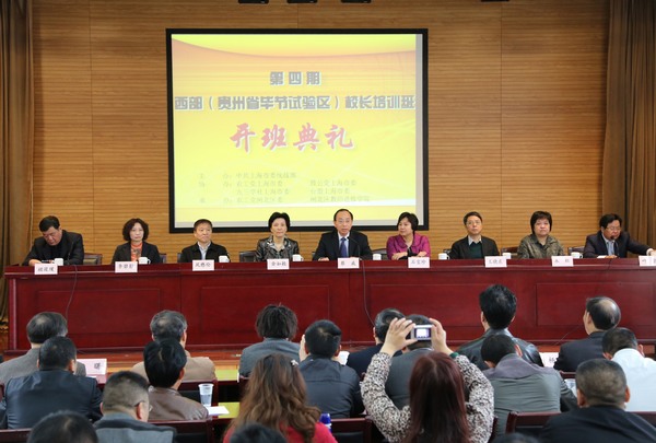 2014年3月26日上午,第四期西部(贵州省毕节试验区)校长培训班开班仪式在上海闸北区教师进修学院举行。本次培训班由中共上海市委统战部主办,农工党上海市委会、致公党上海市委、九三学社上海市委和台盟上海市委协办,农工党闸北区委会、闸北区教师进修学院承办。培训班将围绕学校文化建设、校长课程领导力、教师专业发展、素质教育实施模式等主题开展研讨交流,并通过专题学习、经验分享、校本实践方案设计与交流等方式,梳理出困扰学校发展的深层问题,学习和借鉴有关学校改革和发展的经验。农工党中央副主席、市政协副主席、农工党市委会主委、上海交通大学副校长蔡威出席开班典礼并讲话。中共闸北区委常委、区委统战部部长石宝珍,农工党市委会专职副主委金如颖、秘书长王晓东,致公党市委秘书长凤懋伦,九三学社市委秘书长朱红,台盟上海市委秘书长李碧影等出席仪式。农工党闸北区委会主委、闸北区卫计委主任叶强主持仪式。