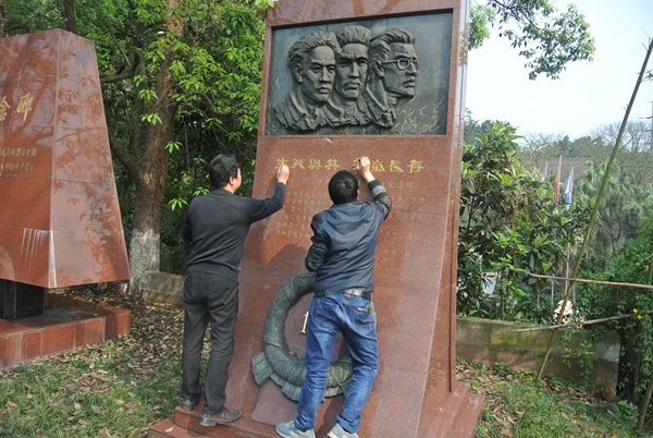 位于歌乐山下的红岩魂雕塑广场的农工党三烈士墓碑因长年风雨侵蚀,其碑文字迹模糊不清,亟待修复。为告慰先烈英灵,清明前夕,经与重庆红岩联线歌乐山烈士陵园管理处联系,农工党沙坪坝区委会专职副主委黄林、重庆市委会委员邓军组织相关人员来到歌乐山烈士陵园,对农工党三烈士墓碑碑文进行了修补。大家顶着烈日,齐心协力,经过近一天的劳动终于完成了对墓碑文字的刷新描字着色工作。