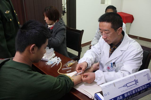 活动中,医卫支部的梅咏春、杨金民等党员为武警战士们抽血检查血型,还向他们讲解了卫生保健知识。