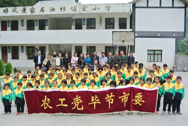 2014年5月14日,农工党毕节市委会副主委唐鹏程带领10余名党员赴大方县雨冲乡油杉小学开展捐赠献爱心活动,向每名学生捐赠一套价值120元的运动服。