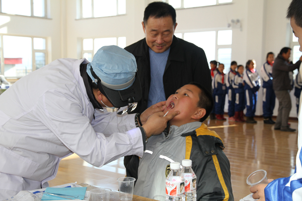 28日早7点30,在浓重的雾霾中,一行四辆车十五人从哈尔滨市区开赴松峰山镇。两个多小时后,队员们到达松峰山同心丽珠希望小学。没有休息,也没有仪式。一下车,无论男女,都自觉搬东西、安置设备。几分钟后,在学校教师的配合下,五年级的学生列队接受牙科和眼科义诊。身着统一预备役制服的“硬汉”,在给每个小学生发放物品时,都放下身段,和谒可亲,脸上带着微笑。一身白衣的牙科专家,在检查时,一口一个“宝宝”,对待小学生像对待自己的孩子一样亲切。有些小学生是第一次接受电子视力测试,怯怯地不敢把头放在支架上,眼睛不住地眨啊眨,一名专家用手温柔地扶着学生的头,另一名专家边耐心操作,边细声安慰。做牙科简易处置的几名专家,更是用精湛的医术,负责的态度,呵护着小同学们脆弱的小牙齿。