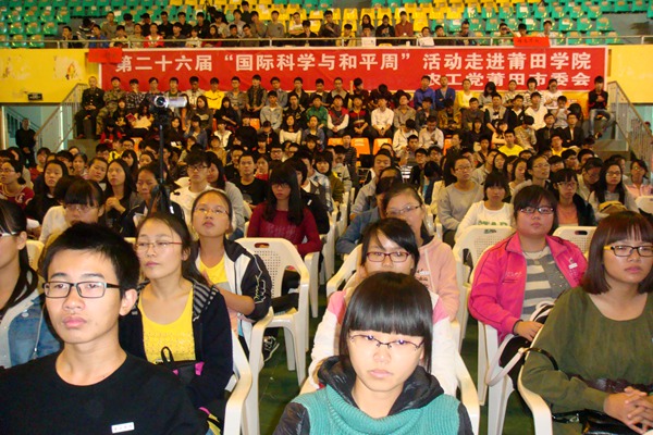 20141118日下午,农工党福建省莆田市委会联合莆田市红十字会、卫生局、教育局等多家单位,在莆田学院体育馆举办“应急救护知识进校园”活动。相关专家和专业人员向师生们深入浅出地讲解了应急救护的相关知识,生动形象地演示了心肺复苏术和创伤后的现场止血、包扎、骨折固定及搬运等基本技能,现场还分发有关资料和急救用品,深受上千名师生的欢迎和好评。这次活动也是农工党莆田市委会开展第26届“国际科学与和平周”系列活动的重头戏。(陈旅棱)