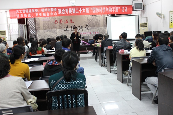 2014年11月12日,农工党福建省委会和农工党福州市委会在温泉街道会议室联合举办第二十六届“中国国际科学和平周”活动。活动邀请福州市红十字会江鲁萍主任为温泉街道的居民做了“急救知识”的讲授;福建中医药大学博士生导师、国医堂主任医师黄海教授做了“认识冠心病与心绞病”的科普知识讲座。
