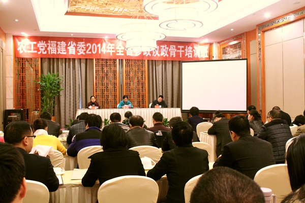 2014年12月12-14日,农工党福建省委会2014年全省参政议政骨干培训班在罗源县举办。农工党福建省委会副主委郑新清到会讲话,罗源县委常委、统战部部长兰可明代表中共罗源县委致辞。会议分别由省委会副秘书长、办公室主任万姗,省委会参政议政部部长黄国先主持。