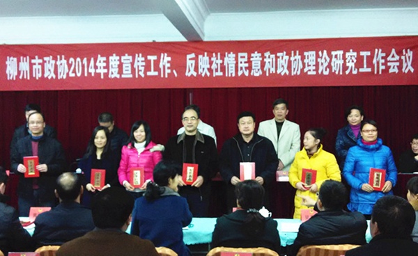 2015年1月7日,柳州市政协召开会议,全面总结柳州市政协系统2014年度宣传工作、反映社情民意和政协理论研究工作。会议对2014年度反映社情民意信息工作、柳州市政协系统网络宣传工作以及政协理论研究工作先进单位和先进个人进行表彰。农工党柳州市委荣会获柳州市政协反映社情民意信息工作先进单位和柳州市政协系统网络宣传工作一等奖。农工党党员朱小乐获反映社情民意信息工作优秀信息员,罗贵强获柳州市政协系统网络宣传工作先进个人。(罗贵强)