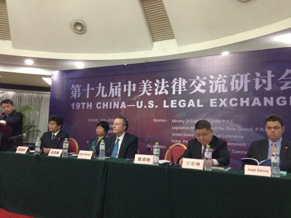 2015年1月15日,第19届中美法律交流研讨会第二场在武汉东湖之滨的弘毅大酒店举行。本次活动由中国商务部、国务院法制办公室、美国商务部、湖北省人民政府共同主办,中美两国政府部门负责人、学界代表、企业代表和律师代表就大气污染防治法律制度和电子商务数据保护制度进行了充分的交流。出席这次会议的美方代表有美国商务部官员、美国驻华使领馆的代表、美国环保署总律师办公室的副主任律师Ethan Shenkman先生和高级律师Steve Wolfson先生、美国佛蒙特法学院美国—亚洲环保法合作伙伴关系研究员William Schulte教授等,中方代表有湖北省政府副省长甘荣坤,湖北省政协副主席、农工党湖北省委会主委吕忠梅,湖北省人大法制委员会副主任委员栾丽娜以及商务部有关领导等。