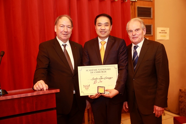 顾晋教授早1992年-1993年留学法国,三十多年来,在积极做好民主党派成员履职工作的同时,始终致力于结直肠癌的临床和基础研究,在直肠癌的外科手术,探索适合中国国情的术前放化疗方案以及相关转化医学研究方面取得了成绩,得到了国际同行的认可。鉴于顾晋教授在结直肠癌领域取得的成绩,法国国家外科科学院于2014年12月邀请顾晋教授赴法国国家外科科学院做专题报告。与顾教授一并获得外籍院士的还有英国著名的结直肠癌专家,国际公认的直肠癌外科手术的先驱Bill Heald教授。这一天,顾晋教授从法国国家外科科学院Jaeck教授手中接过外籍院士的证书和奖牌,这标志着中国外科医生取得的成绩得到法国外科科学院的认可,展现了中国农工民主党党员作为行业精英的风采。(农工党北京市委会宣传处)