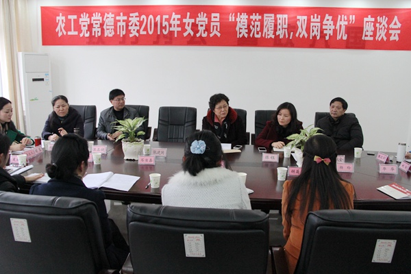 为深入开展坚持和发展中国特色社会主义学习实践活动,引导广大女党员立足本职工作和党派工作,争做双岗履职创优的模范,2015年3月6日下午,农工党常德市委会在机关会议室召开了女党员“模范履职,双岗争优”座谈会。常德市人大常委会副主任、农工党常德市委会主委肖燕芳出席会议并做重要讲话。