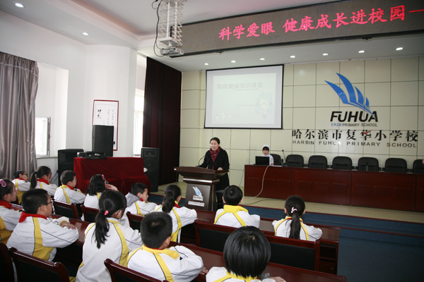 农工党党员、哈尔滨西苑中医医院院长崔红为复华小学四、五年级的全体学生进行了生动有趣的健康用眼知识讲座,学生们和医疗专家进行积极互动,取得了良好的授课效果。