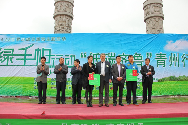 在4月22日第46个世界地球日来临之际,19日上午,由农工党山东省委会、山东绿色低碳经济发展促进中心、青州市人民政府等单位主办的“低碳齐鲁行·绿手帕”公益宣传活动启动仪式在青州东夷文化广场举行。省政协常委、农工党山东省委会秘书长王军,青州市人民政府副市长王万信,山东省绿色低碳经济发展中心秘书长刘景春出席活动并致辞,农工党潍坊市委会主委、奎文区副区长刘棣俭出席了启动仪式。