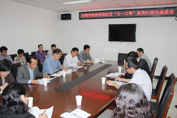 2015年4月28日,中共邯郸市委统战部在市民主党派二楼会议室召开了市统战系统纪念中共中央发布“五一口号”67周年座谈会。中共市委统战部常务副部长王社印出席会议并讲话。农工党邯郸市委会驻会副主委王文峰参加会议并发言。