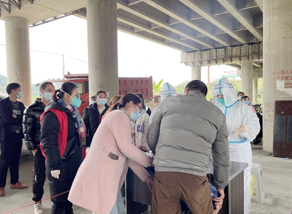 农工党百色市康养支部副主委周皎芮(左三)到右江区汪甸瑶族乡协助开展核酸检测采样工作