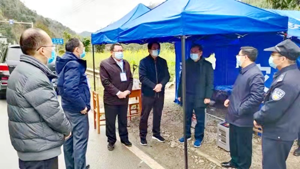 农工党百色市委会主委周永尧(左三)于2月8日在西林县与广南县交界处木呈防控卡点督查疫情防控工作
