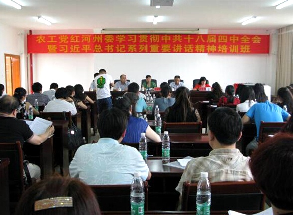 2015年5月20日,农工党红河州委会在蒙自举办学习贯彻中共十八届四中全会暨习近平总书记系列重要讲话精神培训班。红河州人大常委会副主任、农工党红河州委会主委刘竹芬出席开班仪式并讲话。中共红河州委统战部常务副部长杨杰,中共红河州委党校副校长石勇应邀出席开班仪式。培训由州委会副主委纳猛主持。