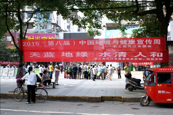2015年6月5日上午,农工党九江市委会联合市环保局、卫计委等部门,按照农工党中央关于“举办2015(第八届)中国环境与健康宣传周活动的通知”要求,围绕“农村环境与健康”主题,深入江西省十大“和谐社区”——庐山区赣北商城社区,举办环境与健康宣传活动。