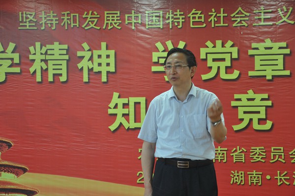 龚建明介绍了农工党全国开展现场知识竞赛的情况,指出农工党湖南省委会开展此次“学精神、学党章、学党史”知识竞赛活动,旨在推动全省农工党各级组织深入学习中共十八大和十八届三中、四中全会精神,以及习近平总书记系列重要讲话精神,深入学习中国特色社会主义理论,深入学习统一战线和多党合作的光辉历史和优良传统,深入学习我党党章党史,在全省形成重视学习、崇尚学习的风尚。希望通过这次比赛,能够使农工党的优良传统内化到全体党员的心中,巩固多党合作的思想政治基础,推动全省学习实践活动引向深入,促使全体党员以更加饱满的热情投入工作,以更加务实的态度对待工作,以更加扎实的作风做好工作,为全面建成小康社会、实现“两个一百年”奋斗目标和中华民族伟大复兴的中国梦贡献智慧和力量,为农工党成立85周年献礼。
