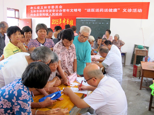 7月4日,农工党玉林市委会联合玉林市政府投资审计办青年文明号和兴业县葵阳镇人民政府,组织市级医疗专家到葵阳镇立石村开展“送医送药送健康”义诊活动,让农民朋友不出村口就能享受到市级专家的优质医疗服务,得到当地群众的一致好评。