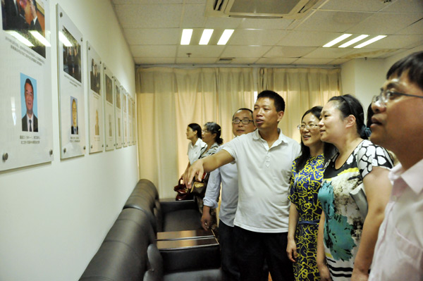 赠书活动结束后,焦统霞一行参观了樊氏图书馆二楼举办的“血与火的考验”历史图片展,重温中国共产党与农工党风雨同舟、荣辱与共的光辉历程,并前往县城参观位于东海县行政中心办公大楼内的“农工党党史陈列室”。樊振向农工党市委赠送了2015年编印的七期《东海农工》。参加赠书活动的党员楼玉平返程后,还通过快递的方式向樊图赠送了《中国图书馆分类法》一书。(郑利达、李锐/摄影)
