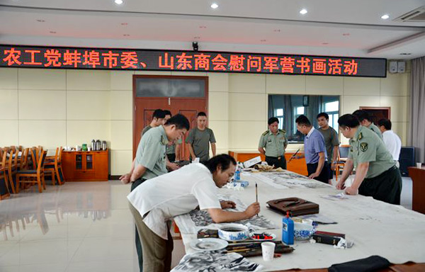 在“八一”建军节即将到来之际,为了向广大子弟兵表达真诚的节日祝福,2015年7月28日,农工党蚌埠市委会联合山东商会组织本市知名书画家王若升、李洪太、徐豪、王海军、金为、秦昊勋等来到蚌埠军分区,开展迎“八一”书画家进军营慰问笔会活动。中共蚌埠市委常委、蚌埠军分区司令梁常信,政委唐遂申等热情接待了书画家一行并全程参与活动。