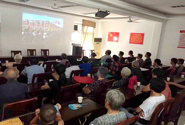 纪念大会正式开始,党员们全体起立,并随着电视播放的升旗仪式齐声高唱国歌。10时20分,习近平主席在庄严雄伟的天安门城楼上发表重要讲话,通过媒体报道传播到全球各个角落。声势浩大的阅兵式集中展示了国产新型现役主战装备,显我军威,显我国力,能够增强民族自豪感。2014年入党的盛晓静激动得热泪盈眶,她表示:“太振奋人心了,我为自己是中国人而自豪!”刘长说:“日本侵华对于中国人来说是一段屈辱的历史,纪念活动可以让国人铭记那段刻骨铭心的历史,催人奋进。在这场战争中,中华民族同仇敌忾,浴血奋战。所以说,纪念抗战也是在弘扬民族精神。”陈福胜结合自己到重庆参观学习的经历告诉大家,中国抗战开始时间最早、持续时间最长,不屈不挠抗争14年,伤亡人数超过3500万……牺牲巨大,贡献卓著。然而,由于种种原因,世界上有不少人对中国抗战历史了解不深、对中国抗战的世界意义认识不够。观看阅兵式既是一堂历史课,也是一堂思想政治课,还是一堂生动的爱国主义教育课,难得的教育机会不容错过。随着战争岁月渐渐远去,如何让全世界特别是年轻一代充分了解中国抗战,成为当务之急。我们最重要的是传承和发扬好中华民族的抗战精神,坚持爱国情怀,为党和人民的事业贡献力量。