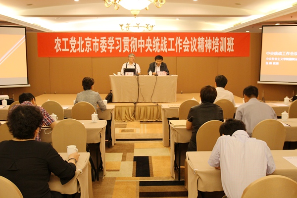 2015年9月22日下午,农工党北京市委会举办了学习贯彻中央统战工作会议精神培训班。邀请中央社会主义学院副院长张峰教授作了有关统战工作会议精神和《条例(试行)》解读的辅导报告。国家中医药管理局副局长、农工党北京市委会主委于文明主持。