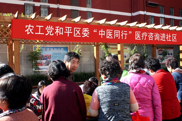 20151011日,农工党天津市和平区委会在和平区南营门街吉利花园社区开展“中医同行”医疗咨询进社区活动。