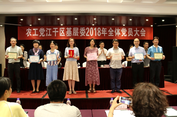 2018年5月25日下午,农工党杭州市江干区基层委召开2018年度全体党员大会,农工党杭州市委会主委周智林、专职副主委倪晓娟,江干区基层委主委李红等出席会议。江干区委常委、区委统战部部长赵欣浩,江干区委统战部常务部长万志勇应邀出席会议。江干区基层委副主委蔡瑾主持会议。