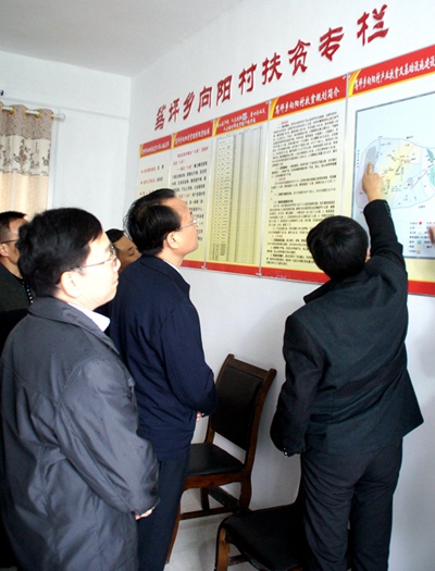 杜黎明随后冒雨视察了向阳村大蒜种植地块,了解大蒜种植面积、市场销售等情况。在向阳村委会,杜黎明登上办公楼,仔细察看脱贫规划图,认真听取村党支部书记杨志国对向阳村基本情况、基础设施建设、产业发展带动贫困户脱贫等情况的介绍。向阳村地处渝鄂交界的偏远山区,幅员面积10.23平方公里,耕地面积3450亩,林地面积7680亩,最高海拔1800米,人均纯收入4980元,6个小组,人口1683人,现有贫困户86户148人。总体上,该村交通便捷出行、居民生活饮用水等问题基本解决,烤烟、魔芋、大蒜、中药材、山羊等产业带动70户贫困户脱贫,政府兜底贫困户16户,2014年常住居民可支配纯收入3200元。当前存在的主要问题是:高山带5社、6社需新修公路9公里,发展壮大药材基地;16户26人需政府和社会救助帮扶;药材、观光产业、居民点建设需资金投入、技术支持。