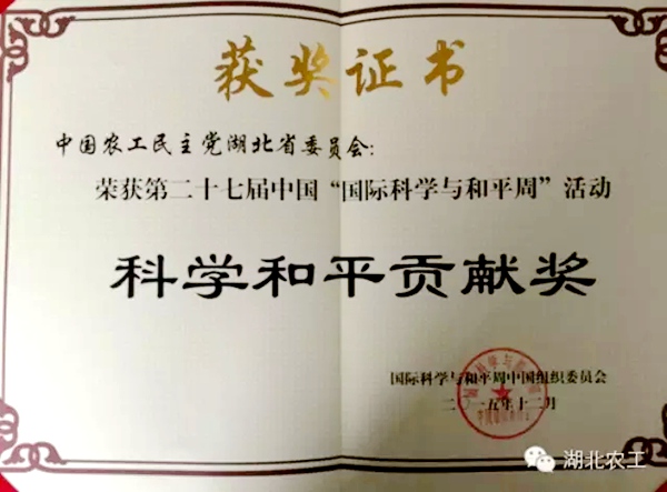农工党湖北省委会在第27届“国际科学与和平周”活动中表现出色,被国际科学与和平周中国组织委员会授予“科学和平贡献奖”。该奖项用于表彰在国际科学与和平周活动中,为国际和平、社会和谐、科学文化传播做出贡献的单位和个人。
