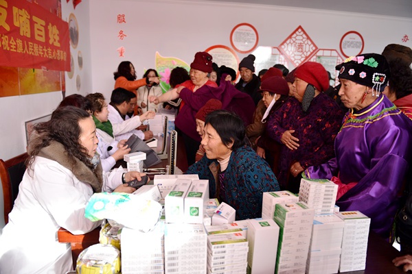 尽管灰腾梁的寒风仍旧那么“热情”,但看到村民的秧歌队、旱船队在火热的锣鼓声中欢迎我们,胸中的暖流涌上心头,也不觉得怎么冷了。党员们立即准备义诊场所,卸下慰问品。兵分两路:一路给村民义诊,免费发放药品,给现场的村民分发米面粮油;一路在主委李一飞的带领下去腿脚不便的村民家中慰问,他们给幸福院的五保户送去了米面油及慰问金。五保户老人激动地给我们烧茶倒水,连连夸赞当今的政策好,夸赞农工党的爱心。