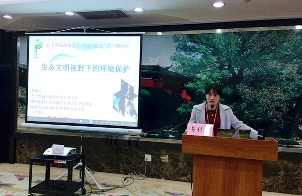 本期活动,市委会邀请农工党温州医科大学支部主委、温州医科大学环境与公共卫生学院教授、瓯海区温瑞塘河管理委员会副主任(挂职)作“生态文明视野下的环境保护”讲座。葛利云教授从生态文明的概念、生态文明与“十三五”规划的联系、生态文明视野下的“水、土、气”污染治理、生态文明下的“低碳经济与可持续发展”等四个方面展开来讲述,给大家带来了一场内容丰富的精彩讲座。
