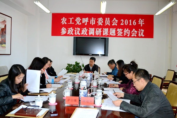 2016年4月22日,农工党呼和浩特市委会召开2016年参政议政调研课题签约会议。农工党呼和浩特市委会主委鲁剑钧出席会议并讲话。中共呼和浩特市委统战部党派处处长李晓红应邀出席会议。农工党呼和浩特市委会副主委岱沁与12位重点调研课题组负责人分别签订了调研课题责任书。农工党呼和浩特市委会2016年重点课题调研工作正式展开。