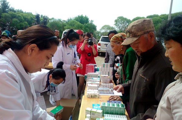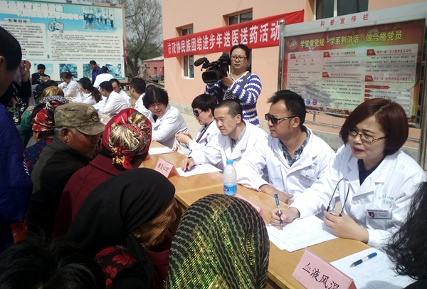 来自石河子大学医学院第一附属医院的党员医疗专家前往133团民族连队进行送医送药活动。在133团九连连部,九连、七连的各民族同胞早已翘首以盼,在两个小时的义诊过程中,党员们不顾烈日当头,认真诊治。本次活动共接待患者200余人次,根据处方免费发放了各类常规药品约3000多元。