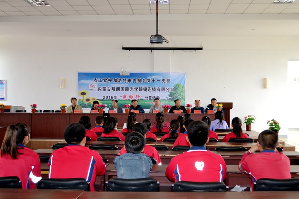 2016年5月13日,农工党呼和浩特市第十一支部、内蒙古明朗国际光学眼镜连锁有限公司2016年“校园光明行”公益活动走进呼和浩特市第九中学,为同学们进行免费视力测试、验光、配镜并讲解护眼知识。农工党呼和浩特市委会副主委岱沁出席活动并讲话。