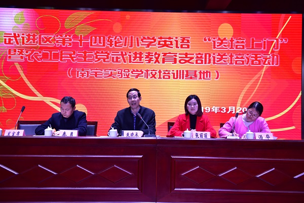2019年3月20日下午,武进区第十四轮小学英语“送培上门”暨农工党武进教育支部送培活动开班典礼在南宅实验学校培训基地举行。武进区教师发展中心副主任、农工党武进教育支部主任朱晓承,送培导师武进区实验小学张丽丽副校长,雪堰中心小学教育集团南宅实验学校执行校长秦勇副校长,雪堰中心小学教育集团南宅实验学校王雪峰副校长以及全体学员参加了本次开班典礼。