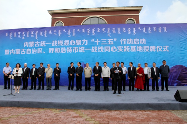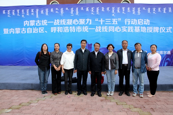 2016年6月14日上午,内蒙古统一战线凝心聚力“十三五”行动启动暨内蒙古自治区、呼和浩特市统一战线同心实践基地授牌仪式在内蒙古呼和浩特市和林格尔县盛乐经济园区举行。农工党内蒙古区委会主委牛广明、副主委王学东、常委鲁剑钧、秘书长耿豫蒙及社会服务部、宣传部有关同志参加授牌仪式。