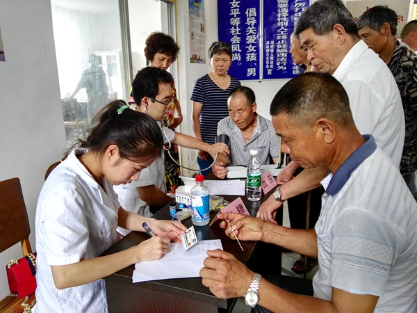 为了给偏僻山村的村民解决一些实际问题,医生专家们就地取材,在村民中心为村民查体看病诊治,免费测血压、测血糖、讲解预防疾病的常识。78岁高龄的血液科专家胡理明主任医师,精神饱满,在近两个小时内共为20多位老人查体看病,一点都不觉得累,这种敬业精神实在令人钦佩和感动。康宁医院的单亦升博士是一位血透专家,亲自为老人量血压看病。康宁医院的林善慧护士很专注地为村民采血测空腹血糖,从康宁医院带过来的50张血糖测试纸很快就用光了。