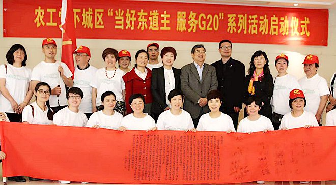 早在去年12月底,杭州市委会就按照中共杭州市委和市委统战部“当好东道主,服务G20”的部署要求,及时发出了携手服务G20峰会的倡议,把助力、助智、助推G20杭州峰会作为时下最重要的责任和使命之一。市委会还发挥党派特色优势,先后推出了“我为G20献一策”“市民群众文明素质提升进社区”“立足本职,争当服务保障的践行者”“律师进社区,助力‘创平安杭州’建设”等系列主题活动。