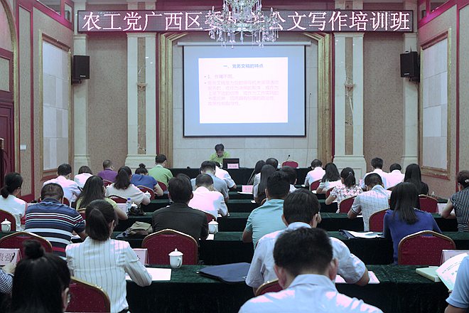 2016年10月12日上午,农工党广西区委会在贺州市举办机关公文写作培训班。农工党广西区委会专职副主委何玉庭为培训班授课。