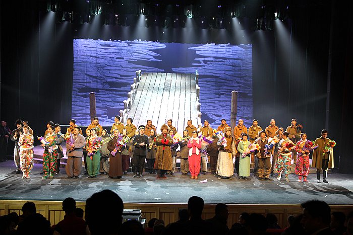 演出结束后,农工党党员代表上台为龙江剧《松江魂》主要演出人员敬献鲜花,以表感谢之情。(文/图 王正波)