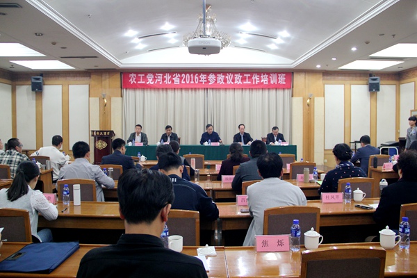 2016年10月19日至20日,农工党河北省委会在石家庄举办2016年参政议政工作培训班,河北省政府参事、农工党河北省委会副主委福强出席开班式并讲话,河北省政府参事室主任、农工党河北省委会副主委徐英出席了开班式并授课,农工党河北省委会机关副巡视员张峻主持开班式,农工党河北省委会秘书长经顺波作结业讲话。